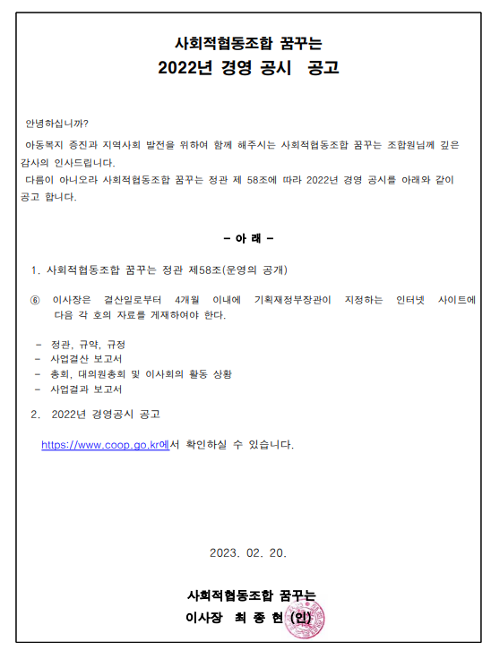 | 다음글 | 2023년 1차 이사회 의사록 및 1차 추경예산 |